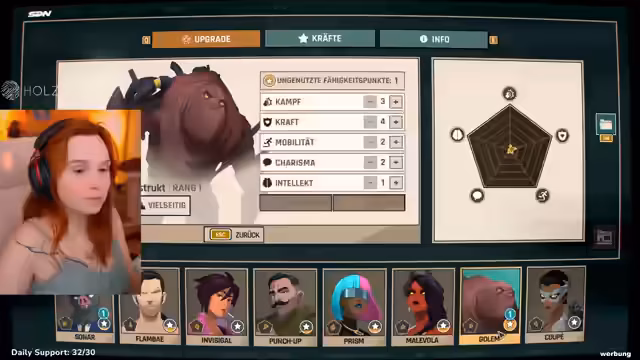 03:10:58Nach Abschluss des Prologs beginnt das eigentliche Kapitel, in dem das Team von Superhelden offiziell ausgewählt wird. Der Streamer stellt ein heterogenes Team zusammen, das unter anderem 'Batboy', 'Invisibitch' und eine Popstar-Heldin namens 'Prism' umfasst. Die Helden verfügen über verschiedene Fertigkeitswerte wie Kampf, Intellekt, Mobilität und Charisma, die der Streamer gezielt auflevelt, um Missionen besser meistern zu können. Besonderes Augenmerk wird auf die 'Invisibitch' gelegt, die sehr agil ist, aber auch unter Asthma leidet.