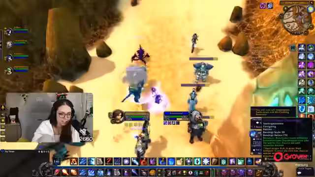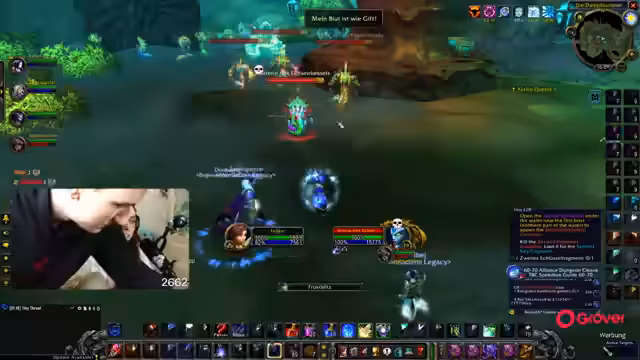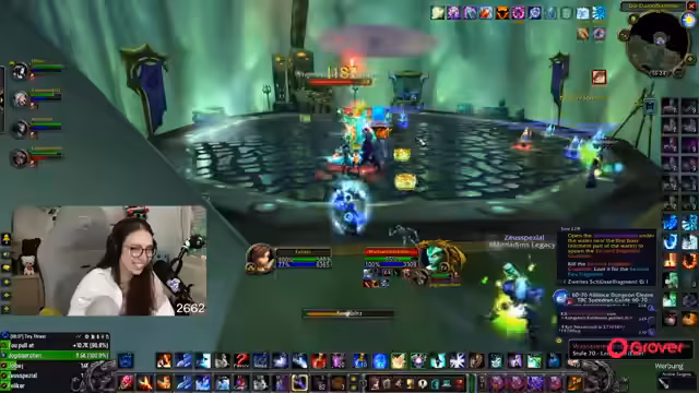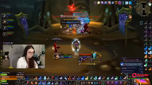 03:01:56Die Streamerin und ihre Gruppe versuchen, ein Heroic Dungeon zu bestehen. Es gibt technische Schwierigkeiten, der Streamer beschwert sich über fehlendes Mana und den Schaden der Gegner. Gleichzeitig wird die Vorbereitung für den Onyxia-Pre-Raid am Sonntag besprochen, wobei die Gruppe noch nicht entspannt ist und einige Versuche bereits gescheitert sind.