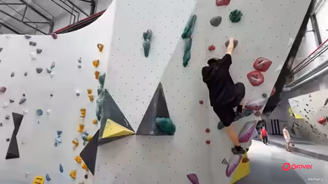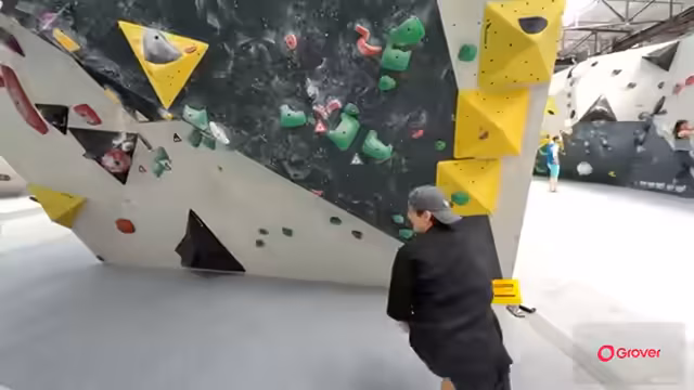 01:43:02Nach dem erfolgreichen Aufwärmen beginnen die ersten Versuche an den Bouldern. Die Gruppe startet mit den leichtesten Routen (Stufe 1), die als perfekt für Einsteiger geeignet beschrieben werden. Die Technik des Boulderns wird erklärt: Es ist eine Disziplin ohne Sicherung, bei der man die Griffmuster mit den Händen und die Beinarbeit nutzt, um nach oben zu kommen. Die erste Route wird geschafft. Der Schwierigkeitsgrad wird mit grünen Markern dargestellt und steigt an, wobei die Schwierigkeit nicht linear ansteigt. Die Teilnehmer motivieren sich gegenseitig und geben sich Tipp, nah an der Wand zu bleiben und mehr aus den Beinen zu drücken als die Arme zu ziehen.