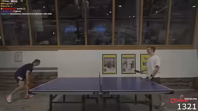02:01:50Das Tischtennis-Spiel beginnt, begleitet von humorvollen Kommentaren aus dem Chat. Die Punkte werden gezählt und das Spiel bleibt bis zum spannenden Schluss offen. Ein Teilnehmer gewinnt knapp mit 11:9. Der Streamer fragt nach der sportlichen Vergangenheit der Spieler und erwähnt, dass einer von ihnen bereits im Verein war. Trotz des ernsten Wettkampfs bleibt die Stimmung locker und spaßig.