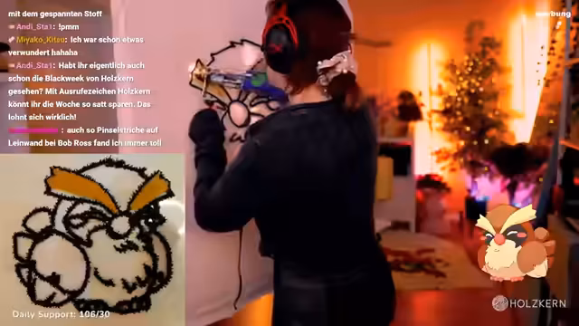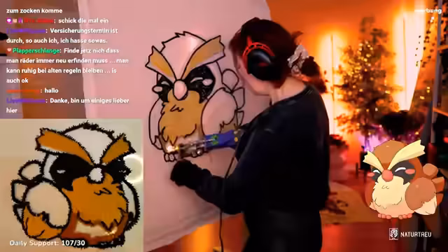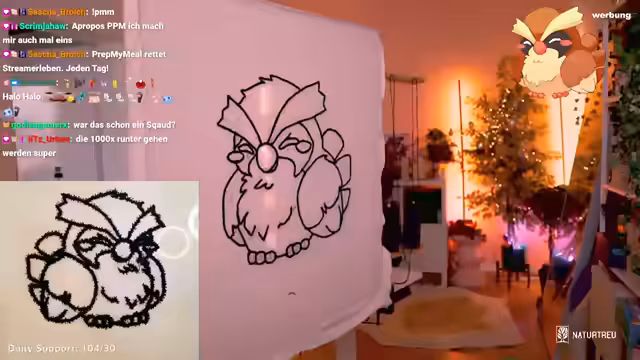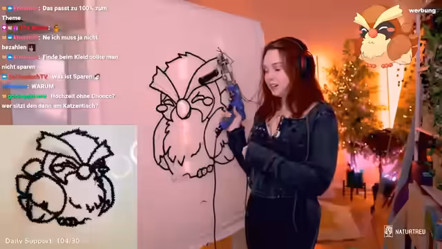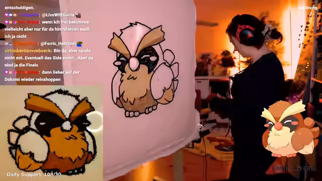 06:01:46Feli plant einen gemeinsamen Stream mit Dilli, dessen genaue Startzeit noch geklärt werden muss, aber voraussichtlich gegen 8 oder 9 Uhr morgens beginnen wird. Währenddessen arbeitet sie weiterhin an dem Taubsi-Teppich für Urban, der als Top-Sub-Gifter des Vormonats ausgewählt wurde. Trotz kleinerer Schwierigkeiten mit gerissenen Fäden und der Notwendigkeit, immer wieder neu einzufädeln, ist Feli entschlossen, den Teppich noch im aktuellen Stream fertigzustellen. Sie freut sich über die Fortschritte und die wachsende Erkennbarkeit des Motivs, was die Zuschauer im Chat ebenfalls begeistert kommentieren.