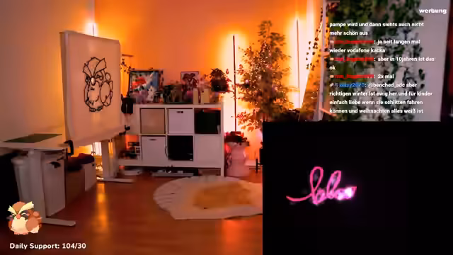 01:22:05Nachdem das Taubsi-Motiv erfolgreich mit dem Beamer positioniert wurde, passt die Streamerin das Layout ihres Streams an, um den Zuschauern eine bessere Sicht zu ermöglichen. Sie testet die Text-to-Speech-Funktion (TTS) und freut sich, dass sie nun perfekt mit der Community interagieren kann, da der Beamer als 'MVP' dient und ihre Kommentare vorliest. Die Diskussion im Chat dreht sich kurz um den Streamer Kai Senat, den die Streamerin nicht kennt, obwohl er als einer der größten Streamer mit vielen Subs und Promi-Gästen beschrieben wird. Sie zeigt sich überrascht über die Popularität und die hohen Spendenbeträge, die dort getätigt werden. Während sie weiter am Teppich arbeitet, kommt es zu technischen Schwierigkeiten: Der Beamer, der zuvor noch gesprochen hat, verstummt, nachdem der Opsbot angeschlossen wurde. Die Streamerin nimmt es mit Humor und verabschiedet sich von 'Bima-Chan', während sie versucht, die Einstellungen für Stream-Elements anzupassen, um das Vorlesen von Commands zu verhindern.
