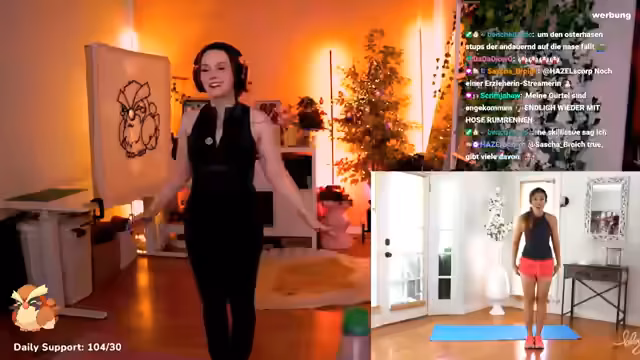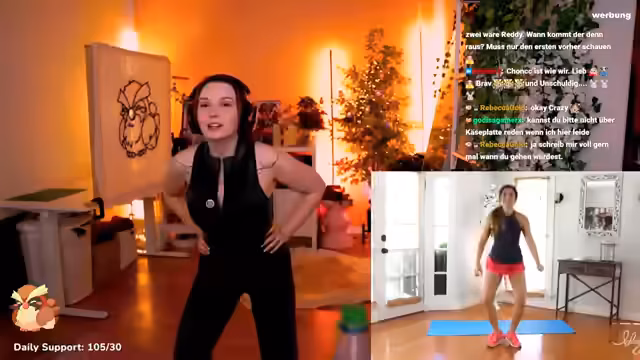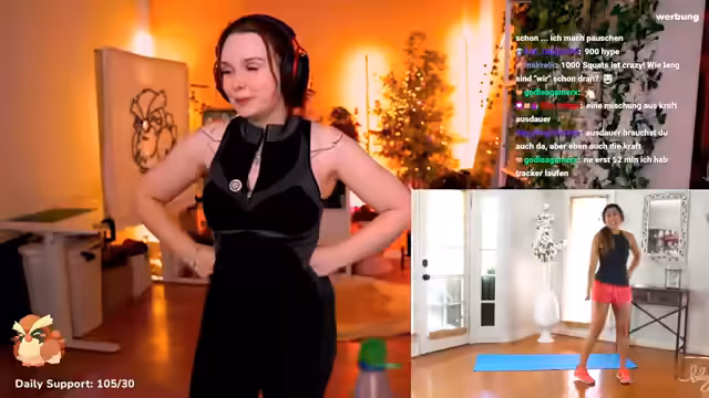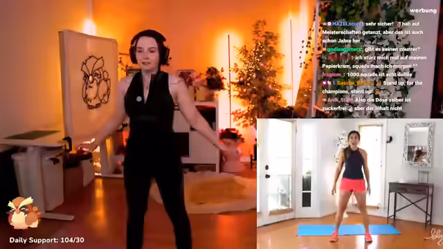 03:20:03Die Streamerin beginnt eine spontane 1000-Squat-Challenge, inspiriert von einem Online-Video, und beklagt bereits nach kurzer Zeit Schmerzen in den Beinen vom Vortag. Sie motiviert die Zuschauer zum Mitmachen und teilt humorvoll ihre Erfahrungen mit früheren Fitness-Herausforderungen. Während der Übungen erinnert sie sich an ihre Hip-Hop-Tanzvergangenheit und die typischen Moves. Sie erwähnt, dass sie ihren Hochzeitstanzsong gefunden hat, den sie aber noch nicht verraten möchte. Die erste Hürde von 100 Squats wird genommen, gefolgt von einer kurzen Pause und weiteren Tanzanekdoten, darunter ein Auftritt als Baum in einem Kindertheaterstück zu "Stups, der kleine Osterhase" und ein "Triangel-Moment" bei einer Musikschulaufführung, was sie als Kindheitstraumata bezeichnet. Trotz der körperlichen Anstrengung und des Schmerzes bleibt sie motiviert und erreicht die Marke von 200 Squats.