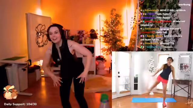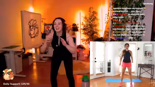 03:58:20Die Streamerin führt ein intensives Workout durch und macht 1000 Kniebeugen, was sie als sehr schmerzhaft und anstrengend empfindet. Sie überlegt, ob sie die letzten Übungen durchhält oder sie abändert. Parallel dazu plant sie einen Kinobesuch für den Film 'Wicked 2' im Astor Film Lounge in Frankfurt und lächtet die Community für ein gemeinsames Erlebnis. Sie erkundigt sich nach verfügbaren Terminen und ob unter der Woche oder am Wochenende besser passt, da ihre Wochenenden oft ausgebucht sind.