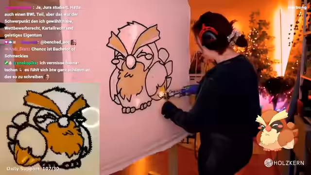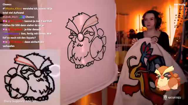01:10:26Die Streamerin erklärt, warum sie keine Teppichaufträge annimmt: Die geringe Gewinnspanne nach Abzug von Mehrwertsteuer, Einkommenssteuer und Materialkosten macht es unwirtschaftlich. Für einen Teppich, der sechs bis zehn Stunden Arbeitszeit erfordert, blieben bei einem Verkaufspreis von 400-500 Euro nur etwa 60 Euro Gewinn. Sie bereitet sich darauf vor, das Taubsi-Motiv mit einem Beamer auf den Stoff zu projizieren. Persönlich berichtet sie von Schlafproblemen und Albträumen, die oft mit Verlustängsten zu tun haben und auf frühere traumatische Beziehungen zurückzuführen sind. Sie erwähnt, dass ihr ein Therapeut empfohlen wurde, sie aber aufgrund ihres vollen Zeitplans keine Zeit dafür findet. Trotzdem betont sie, dass es ihr mental, was die Arbeit angeht, besser geht als im letzten Jahr, als sie unter Problemen mit den Zuschauerzahlen litt. Sie ist froh, mental gewachsen zu sein und sich nicht mehr so viele Gedanken zu machen, sondern den Spaß an der Arbeit in den Vordergrund zu stellen.