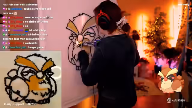 06:02:15Ein gemeinsamer Stream mit Dilli wird für den nächsten Tag in den frühen Morgenstunden geplant, bei dem auch League of Legends gespielt werden soll. Parallel dazu wird an einem Teppich für den Top-Sub-Gifter Urban gearbeitet, der fast fertig ist und ein kleines Taubsi darstellt. Streamerin äußert Freude über den gemütlichen und entspannten Aspekt des gemeinsamen Streams und des Teppichwirkens.