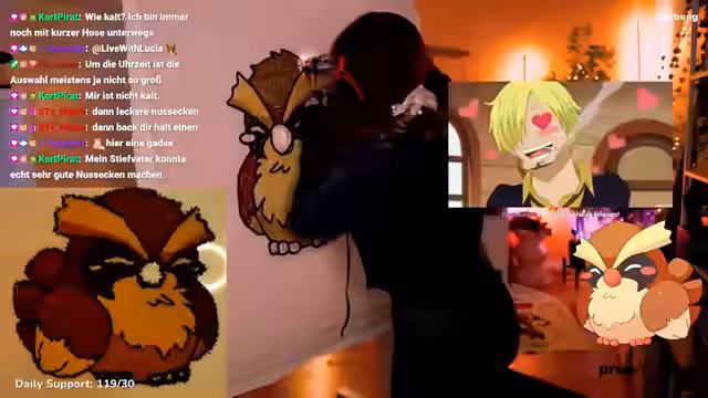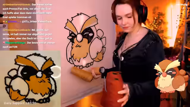05:11:23Die Streamerin und ihre Community unterhalten sich über das One Piece TCG. Sie erzählt von einem Teilnehmer bei einem Pre-Release, der eine seltene Shanks-Karte im Wert von 600 Euro gezogen hat, was sie neidisch, aber auch begeistert machte. Sie berichtet von ihren eigenen Glückserlebnissen im Pokémon TCG, bei denen sie häufig seltene Karten wie Secret Rare und 'Chase-Karten' zieht. Der Stream endet mit der Fertigstellung eines Teppichauges und der Ankündigung eines gemeinsamen Kinobesuchs mit Nemo, einem ESC-Gewinner, den sie zufällig in einem Brettspielecafé traf.
