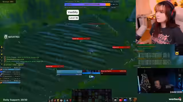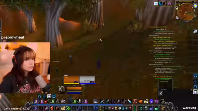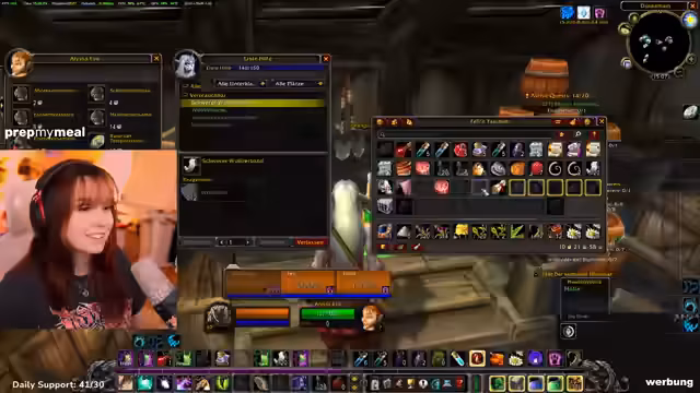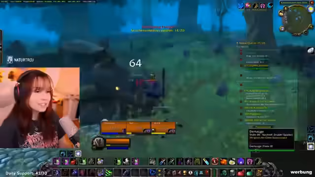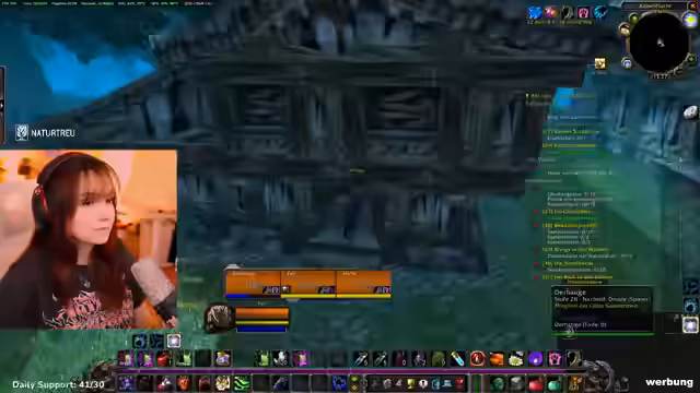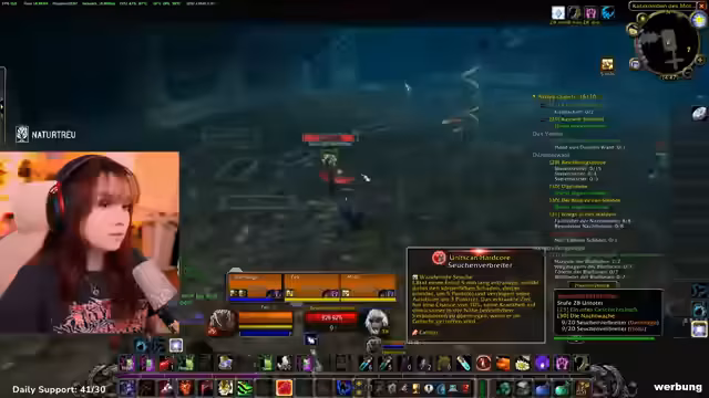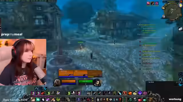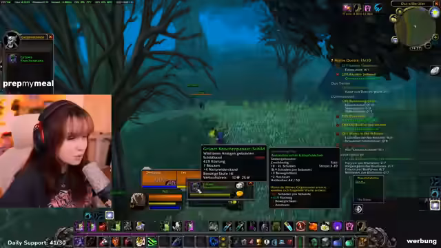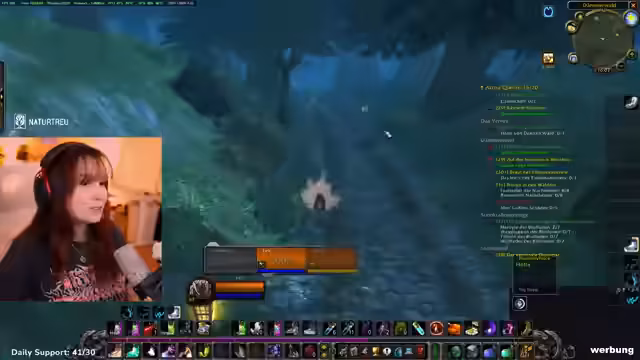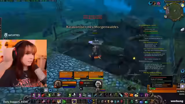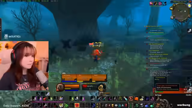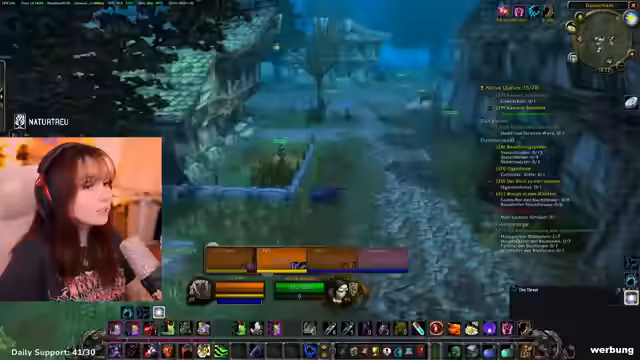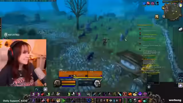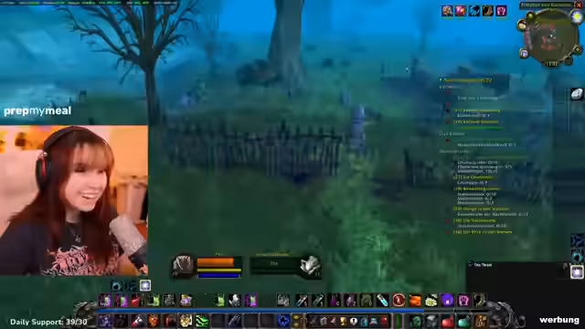 03:28:43Da das Erreichen von Level 30 naht, plant die Streamerin ihre nächsten Schritte in World of Warcraft. Sie geht online, um mit Gildenmitgliedern wie Gucci Warrior zu kommunizieren und ihm eine gebrauchte Fähigkeit (Lebenswurz) zu geben. Gleichzeitig sucht sie aktiv nach Quests, die sie in ihrer Umgebung erledigen kann, und plant, sich den Buff des Jahrmarktes zuholen, bevor sie sich auf gefährlichere Gegner wie Ghouls und Wolfsreiter stürzt.