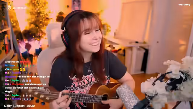01:20:34Nachdem 'Fireflies' die Stimmung im Chat positiv beeinflusst hat, bietet der Streamer eine Zugabe an. Er wählt den Song 'Toss a Coin to Your Witcher', den er auf der Ukulele begleitet. Während des Liedes interagiert er intensiv mit dem Chat, der ihm durch Emotes und positive Nachrichten Rückmeldung gibt. Der Streamer bittet die Chat-Mitglieder, ihm Liebe zu schicken und ist zufrieden, dass die Stimmung nun auf einer positiven Skala von 7 bis 10 liegt. Es folgt eine weitere musikalische Aktion und eine Pause für den Streamer, um sich etwas zu essen zu holen.