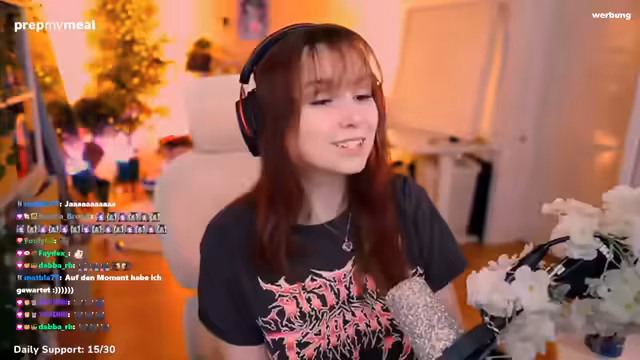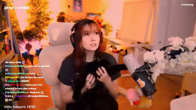 03:02:13Die Streamerin isst eine Thunfisch-Pizza von Prep My Meal, deren Zwiebeln ihr Verlobter Timo für sie entfernt hat. Während des Essens muss sie ihren Kater Chonk aus dem Stream-Raum entfernen, da er nicht von Pizza essen darf. Sie verabschiedet sich liebevoll von ihm, gibt jedoch zu, dass sie aufgrund der kleinen Pizza nicht satt geworden ist und eine große Portion als einzige Unterkunft bezeichnet.