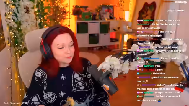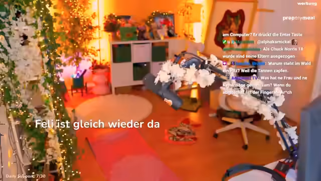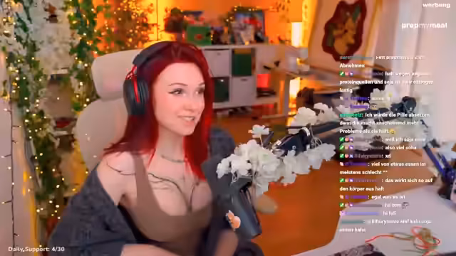 04:07:06Feli isst ihr Omelette mit Jägersauce und Brokkoli, das sie von PrepMyMeal bestellt hat, und empfiehlt den Service ihren Zuschauern. Sie gibt sogar einen Rabattcode 'Feli' weiter, mit dem man 5% sparen kann. Zudem spricht sie über die Vorbereitungen für ein Community-Treffen, erwähnt Brettspiele wie Everdell und wirbt zur Anmeldung für das Treffen.