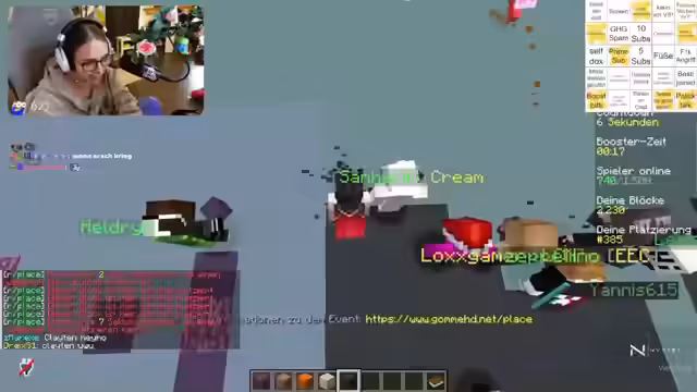 03:52:09Der Streamer ist wieder im Kriegsmodus und kurz vor dem nächsten Crash-Out. Es wird erwähnt, dass der nächste Crash-Out auch ein Bingo-Feld wäre. Es wird festgestellt, dass der Crash-Out nicht ehrlich war und deshalb nicht abgehakt wird. Die Leute, die hier sind bei anderen, das sind Helden und Heldinnen. Es wird kurz einmal abgecheckt, wer alles da ist. Es wird festgestellt, wie weit sie schon sind. Der Name des Streamers steht da ja gar nicht mehr. Es wird überlegt, wie weit die Magma gehen soll. Es wird erklärt, dass jede Person nur alle 10 Sekunden, wenn Booster aktiv ist, etwas setzen kann. Die Leute können auch einfach so Knochenblöcke setzen. Die Erklärungen dazu sind im Discord zu finden.
