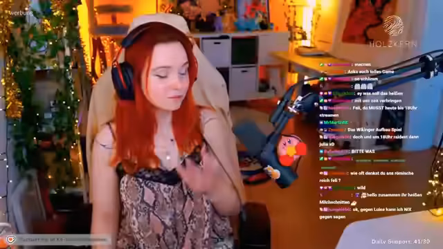 04:59:56Die Streamerin erkundigt sich nach der Nachtschicht eines Zuschauers und scherzt über das Lenkrad voller Aufkleber. Sie bietet an, bei Tonproblemen zu helfen und plant, sich mit anderen im Channel zu treffen. Es wird über die Arbeit bei Boeing diskutiert und die Streamerin äußert den Wunsch, nicht abzustürzen. Sie erzählt von ihrer Flugangst als Kind und einem traumatischen Filmerlebnis. Mittlerweile fliegt sie aber gerne und hofft, bald nach L.A. fliegen zu können. Es wird über das Reisen mit Babys diskutiert und die Streamerin findet es egoistisch, mit Babys zu fliegen. Sie fragt nach einem Mod-Urlaub und erwähnt ihre geplante Lipödem-OP, die teuer ist. Ein Zuschauer schlägt vor, Julia zu Hause zu raiden.
