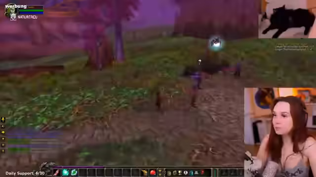 03:03:40Nachdem der Charakter erstellt ist, betritt die Streamerin die Welt von WoW Classic und erhält ihre ersten Quests: Sie soll sieben junge Nachtsäbler und vier junge Distel-Eber töten. Sie erledigt die Quests, bemerkt aber zunächst, dass sie die falschen Mobs (räudige Nachtsäbler) bekämpft hat. Nach einigen Kämpfen erreicht sie Level 2 und erhält als Belohnung Handschuhe, die sie auswählt und anzieht. Sie muss lernen, wie man Quests (L-Taste) und die Karte (M-Taste) öffnet, und stellt fest, dass ihre Nahkampfangriffe weniger effektiv sind als ihre Zaubersprüche. Sie sucht nach weiteren Quest-Zielen und interagiert mit anderen Spielern, lehnt jedoch Einladungen in Gruppen ab, um die Quests alleine zu erledigen.