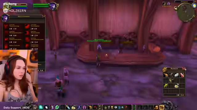 01:12:05Die Unterhaltung dreht sich um die bevorstehende WoW-Event-Teilnahme. Feli plant, als Nachtelfe zu spielen und sucht nach weiteren Nachtelfen-Spielern für eine Gruppe. Sie erwähnt, dass die Allianz bei einer Abstimmung mit 76 zu 55 Stimmen gegen die Horde gewonnen hat und listet potenzielle Mitspieler wie Sola, Jen, Ivaldris und Genie auf. Sie überlegt, ob sie Priester oder Druide spielen soll, da Druide zwar beliebt, aber Priester als Heiler gefragter sein könnte. Dabei kommt sie zu dem Schluss, dass sie wahrscheinlich einen Druiden wählt, um nicht den 10. Jäger in einer Gruppe zu sein.