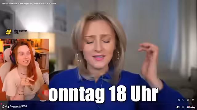 02:01:48Nach der ernsten Stimmung wird bewusst ein thematischer Wechsel vollzogen, um von den düsteren Gedanken abzulenken. Der Streamer entscheidet sich, ein Reaktionsvideo von Sascha anzuschauen. Dieses Video behandelt die Rückkehr von Deutschland sucht den Superstar (DSDS), was die Aufmerksamkeit auf ein anderes, unterhaltsameres Thema lenkt und den Ton des Streams verändert.