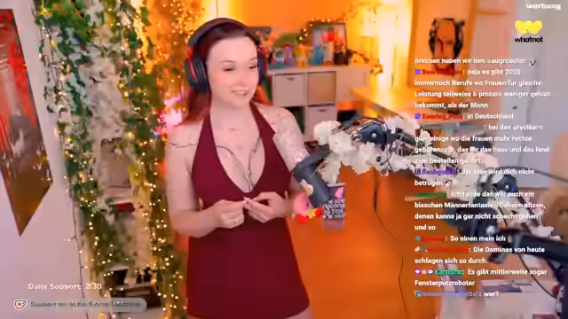 00:08:44Der Stream beginnt mit einer persönlichen Begrüßung der Zuschauer und eines kleinen technischen Checks. Die Streamerin steht und beschreibt, wie warm es in ihrem Raum ist und dass sie deshalb im Steame startet. Sie trägt ein rotes Kleid, das ihr gut gefällt, und erwähnt, dass es ihr gestern in Weiß getragen hat, nachdem es eine Freundin vergessen hat. Nach einer kurzen Begrüßungswelle für verschiedene Chatter, geht sie auf ihre fehlende Körperpflege ein und stellt fest, dass sie noch kein Make-up aufgetragen hat. Sie erwähnt ebenfalls, dass sie eventuell zu lange geschlafen hat und sich nun auf den Stream vorbereitet, wobei sie Themen wie Boxbreak und Bassi andeutet.