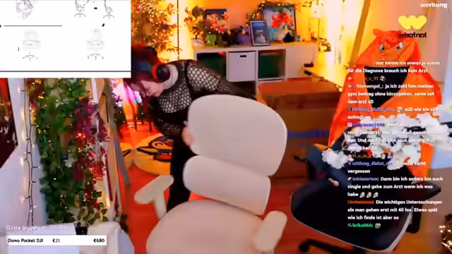 02:09:27Feli montiert die Kopfstütze an ihrem neuen Stuhl. Sie zeigt den fertigen Stuhl und findet ihn sehr hübsch. Sie wollte schon immer einen hellen Stuhl haben. Feli benutzt Bartöl und fühlt sich wie ein Sir. Sie überlegt, sich einen Zylinder zu kaufen. Sie bewundert die Möglichkeit, eine Beinauflage am Stuhl anzubringen. Feli befestigt das letzte Teil und erklärt den Stuhl für fertig. Sie lobt den Komfort und die Optik des Stuhls. Sie empfiehlt den Stuhl an Zuschauerinnen, die einen cremefarbenen Gamerstuhl suchen. Feli erwähnt, dass sie die Emotes von Abby Daisy hat, die sehr teuer sind. Sie findet Bürostühle generell besser als Gamerstühle und lobt das durchlässige Material des Stuhls. Sie erzählt von Pro-Gamern, die den Markus von Ikea mögen. Sie lobt die weiche Sitzfläche des Stuhls und vergleicht sie mit Wolken. Sie wollte einen hellen Stuhl haben und ist froh über ihre Wahl.
