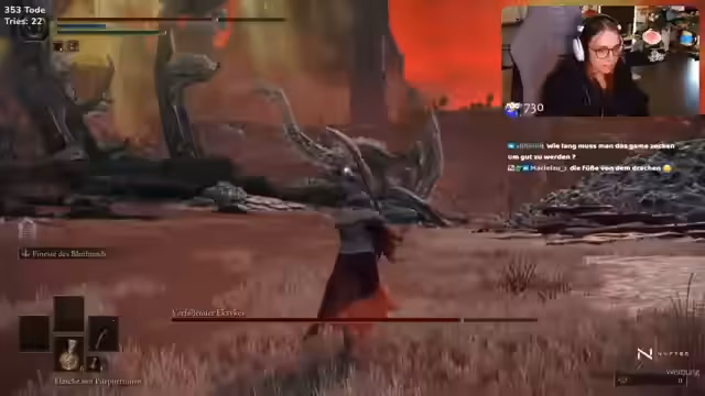 01:06:16Der Fokus des Streams verlagert sich auf den Gameplay-Teil in Elden Ring. Die Streamerin befindet sich im Kampf gegen den Flammenherold, einen Boss, den sie als extrem nervig und unfair beschreibt. Sie klagt über seine Bewegungen, Attacken, insbesondere das rote Areal, und seine Tendenz, immer genau dort hinzugehen, wo sie sich befindet. Sie verliert mehrmals ihr Pferd, was den Kampf zusätzlich erschwert, und ist frustriert über die Chat-Kommentare, die alles besser zu wissen scheinen. Trotz der wiederholten Tode gibt sie nicht auf und versucht, die Attackenpatterns des Bosses zu erlernen.