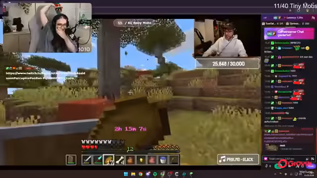 02:38:13Nachdem im Dorf genügend Gold gesammelt wurde, beschließt der Streamer, das Mesa-Biom zu erkunden, um mehr Eisen und andere Ressourcen zu finden. Dabei werden Tiere wie Kühe und Schafe mit Weizen gezüchtet. Eine rosa Schaf wird als zufällige Entdeckung erwähnt, die für Überraschung sorgt. Der Streamer stellt auch fest, dass Schafe Gras fressen können, was eine Neuheit darstellt.