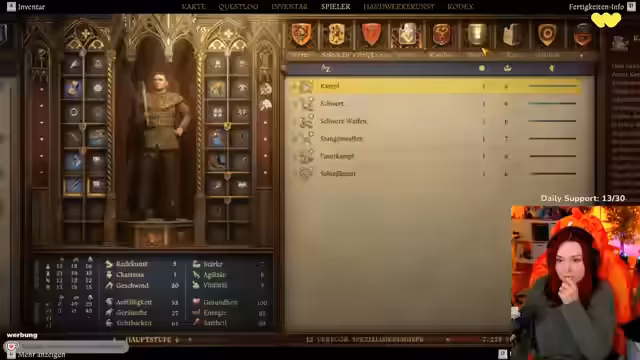 04:43:15Die Streamerin erreicht das Lager von Kater, einem Kampfkunstlehrer, der von Bären aufgezogen wurde. Sie beginnt das Training, merkt aber schnell, dass sie im Kampf nicht besonders talentiert ist. Währenddessen hat sie finanzielle Sorgen, da sie kaum Gulden besitzt. Sie erfährt von einer weiteren Quest, bei der sie eine vermisste Tochter finden soll, hat aber keine geeignete Waffe für den Kampf.