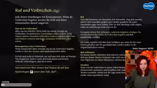 05:26:46Die Streamerin wird in Semin von einem Bewohner herausgefordert, will aber nicht kämpfen. Sie beschließt, die Nacht in der Stadt zu verbringen und sucht nach einem Schlafplatz. Gleichzeitig versucht sie erneut, ihr Pferd Pebbles zurückzubekommen, scheitert aber erneut am Preis. Frustriert über die vielen Hindernisse und ihr leeres Portemonnaie, entschließt sie sich, den Stream vorzeitig zu beenden, da sie noch einen Termin in der Stadt hat.