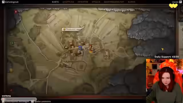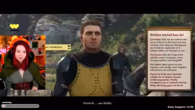 04:09:27Die Streamerin sucht Informationen über ihren verschwundenen Freund, Herrn Drossel den Vogt. Sie trifft auf einen Hinweisgeber, der von einem Überfall berichtet, bei dem das Gefolge des Herrn getötet wurde. Der Herr selbst ist verschwunden, nachdem er beleidigt wurde, und wird seitdem vermisst. Der Hinweisgeber bezweifelt die Geschichte, da der Herr nicht in die Burg ging, wo er hätte nach Hilfe suchen können.