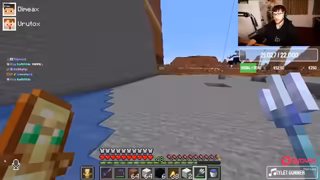 10:22:40Der Streamer sucht aktiv nach Blöcken wie Terrakotta und Granit, die er für sein Bauprojekt benötigt, und erkundigt sich im Chat, ob andere Spieler Überschüsse haben. Er trifft auf Dimeax, der ebenfalls Terrakotta benötigt und an einem Turm baut. Sie vereinbaren, sich zu treffen und Materialien wie Blöcke, Eisen und sogar Diamanten zu tauschen, was die kooperative Atmosphäre im Server unterstreicht.