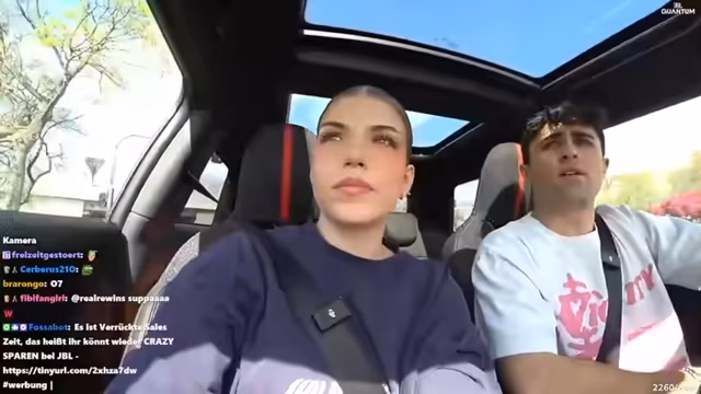 02:23:44Die Fahrt zur Kirmes wird angekündigt, wobei humorvoll erwähnt wird, dass die Fahrgeschäfte möglicherweise alleine gefahren werden müssen. Die Gesprächspartnerin gesteht, kein gutes Navi-Talent zu haben. Es wird über eine frühere Challenge gesprochen, so schnell wie möglich nach Berlin zu fahren. Es wird festgestellt, dass die Haut aufgrund von Kreatin schlechter geworden ist. Ein Wortspiel über einen Ring im Zahn und einen Zahn im Ring wird als Lebensweisheit bezeichnet. Es wird über Hautprobleme und die Einnahme von Nahrungsergänzungsmitteln diskutiert. Der Beifahrer lobt das Fahrgefühl des Autos. Es wird überlegt, ob man sich mit Tim treffen soll, aber betont, dass man nicht zu lange bleiben wird. Eine Anekdote über eine Begegnung mit unfreundlichen Nachbarn wird erzählt. Abschließend wird den Nachbarn ein Gruß ausgesprochen und um Entspannung gebeten. Es wird kurz über das Zünden eines 'Deep Dog' gesprochen und Witze über die Fahrt im Auto gemacht.