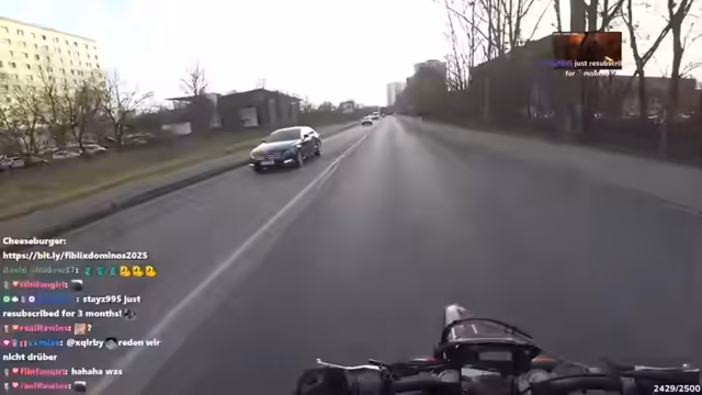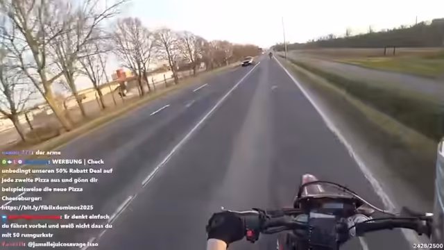 07:08:16Ein unerwartetes Zusammentreffen mit anderen Verkehrsteilnehmern führt zu humorvollen Versuchen, Kontakte zu knüpfen. Die Streamerin entdeckt einen anderen Mopedfahrer und versucht auf witzige Art, dessen Aufmerksamkeit zu erlangen und eine Freundschaft anzubahnen, indem sie ihm hinterherfährt und ihn anspricht. Die Versuche gestalten sich jedoch schwierig, da der andere Fahrer scheinbar desinteressiert ist. Trotzdem wird die Idee einer Freundschaftsanfrage per Luft in den Raum geworfen. Es wird spekuliert, ob der andere Fahrer zur Tankstelle muss, und die Streamerin überlegt, ihm dorthin zu folgen. An einer Ampel wird ein letzter Versuch unternommen, ein Gespräch anzufangen, aber letztendlich wird der Versuch aufgegeben. Die Streamerin reflektiert enttäuscht über die Schwierigkeit, Freunde zu finden, selbst wenn man das gleiche Hobby teilt. Die Fahrt geht weiter, und es wird überlegt, ob der andere Fahrer sie erkannt hat und bewusst ausweicht.