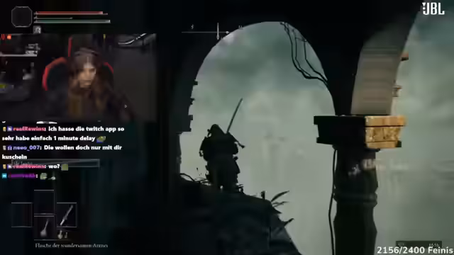 00:54:02Nach der Niederlage gegen Margit verliert der Streamer zunehmend den Spaß am Spiel. Er ist frustriert über die komplexen Level-Designs und das Fehlen von „Gnaden“ (Save Points), was zu wiederholten Toden und langen Laufzeiten führt. Obwohl Chat ihm Tipps gibt, wirkt er überfordert und genervt vom Spiel. Er äußert den Wunsch, ein anderes, zugänglicheres Spiel wie League of Legends oder Valorant zu spielen, da er im lauten Messesetting nicht die Konzentration für Elden Ring aufbringen kann.