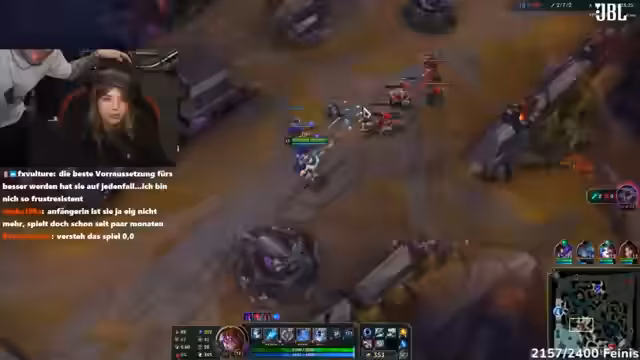 01:52:46Fibii diskutiert mit Anni über das Spiel und kritisiert, dass diese mit dem Chef auf Range spielen müsse. Sie erklärt, dass sie Toplane aufgegeben hat, da sie gegen Nasus spielen muss. Sie äußert sich abfällig über das Gameplay ihres Teams und kündigt ein FF an. Sie analysiert, dass das ganze Team schlecht ist und der Kha'Zix keine Lust mehr hat. Fibii erklärt, dass sie nicht lange spielen wird und dass es Spaß macht, das Abfeuern bei anderen Leuten mitzuerleben. Sie analysiert, dass man in dieser Elo nur Botlane spielen kann, da die Chancen hoch sind, dass zwei von denen scheiße sind. Sie erklärt, dass sie jede Runde, die sie Toplane spielt, verliert, weil auch Botlane reinscheißt. Sie erklärt Neo, wie man gegen Nasus spielt, indem man die Wave bei sich hält und ihn nicht zum Stacken kommen lässt. Sie erklärt, dass jedes Level äquivalent zu 300 bis 400 Gold ist und der Gegner 1200 Gold mehr hat als sie.
