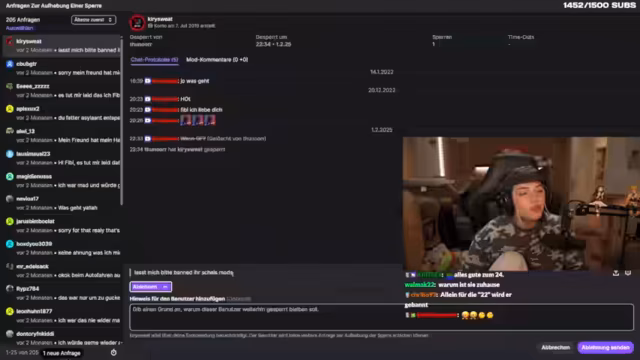 07:38:53Der Streamer startet eine Segment namens 'Entbannungsanträge'. Dabei prüft er gebannte Nutzer und entscheidet, ob sie wieder in den Chat dürfen. Er beginnt mit einem Nutzer, der nach sechs Monaten gesperrt wurde und den er sympathisch findet. Weitere Anträge führen zu humorvollen und bizarren Konfrontationen. Er ignoriert beleidigende Kommentare oder nutzt sie für humorvolle Einlagen. Bei rassistischen oder homophoben Bemerkungen ist seine Entscheidung klar: die Nutzer bleiben dauerhaft gesperrt. Das Ganze dient als Unterhaltung und Moderationstool.
