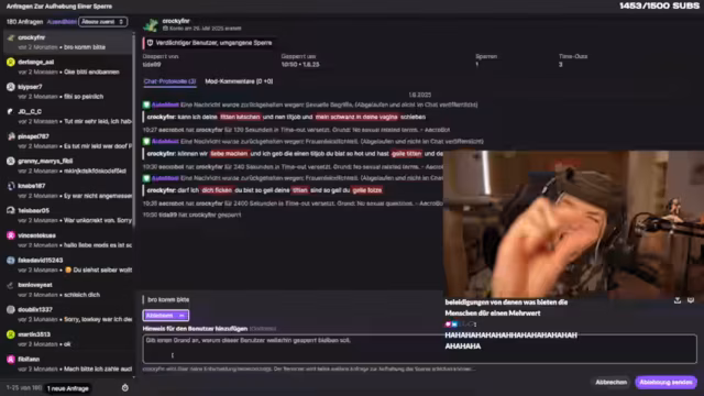 07:55:53Der Stream thematisiert wiederholt, wie sexuell explizite und beleidigende Kommentare im Chat zu Sperren führen. Ausdrücke wie 'geile Sau, zeig Arsch' werden als unangemessen und nicht als Kompliment bezeichnet. Der Streamer geht auf die psychische Belastung durch solche Nachrichten ein und fragt sich, wie Menschen zu solchen Äußerungen kommen können. Zahlreiche Anträge auf Entsperrung werden mit wiederholten Beleidigungen abgelehnt, was die anhaltende Störung durch Nutzer zeigt.