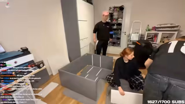 01:23:14Ein wesentlicher Teil des Streams ist der gemeinsame, aber äusserst schwierige Aufbau eines IKEA-Kleiderschranks. Streamer und ihr Freund Tobi versuchen, die Schrankteile gemäss der Anleitung zusammenzusetzen, stossen aber auf ein Problem: Ein Schlüsselteil weist die notwendigen Löcher und Noppen nicht auf, was den Zusammenbau unmöglich macht. Die Streamer vermutet einen Produktionsfehler und ist frustriert über die Situation, während der Chat Ratschläge gibt.