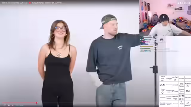 01:37:28Der Stream begrüßt die Zuschauer und kündigt ein geblinddates mit mehreren frischen Kandidaten und einer Kandidatin an. Nach einer kurzen Bewerbepause stellt er die Kandidatin vor, die momentan keinen großen Druck verspürt. Die männlichen Kandidaten werden als sehr fresh beschrieben und präsentieren sich nacheinander: Kilian (21, Tourismusmanagement), ein BWL-Justus, der selbstständig in der Wirtschaft ist, ein weiterer BWL-Justus und weitere Teilnehmer. Der Fokus liegt auf der Vorstellung ihrer Berufe und ihres Hintergrunds.