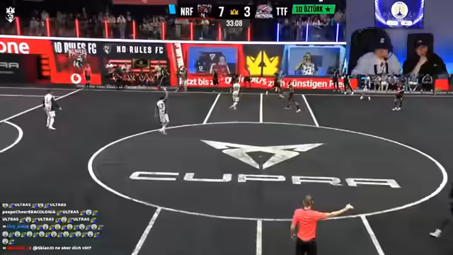 00:36:41Nach der regulären Spielzeit steht es 7-3 für No Rules. Die Spannung steigt, als ein Elfmeter ansteht. Die Streamer diskutieren über die Druckmomente bei der Ausführung. Gleichzeitig treten technische Probleme auf, die den Ton des Stadions für die Zuschauer stumm schalten. Das Team arbeitet daran, die Mikrofone anzupassen und den Sound zu verbessern, um die Atmosphäre wiederherzustellen.
