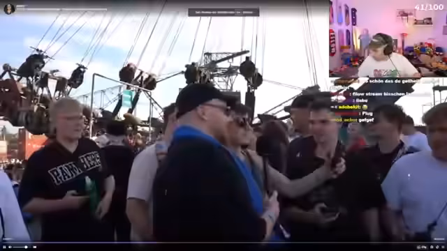 02:46:55Der Streamer und seine Gruppe sind unterwegs, um verschiedene Challenges am Festivalgelände zu bewältigen. Dabei gibt es eine spontane Interaktion mit einem Festivalmitarbeiter, der auf Englisch angesprochen wird. Der Streamer beschreibt das derzeitige Geschehen als etwas chaotisch, betont aber die positive Stimmung und den Spaß, den er mit seiner Crew hat. Er erwähnt auch den Plan, mit einer anderen Gruppe die respective A/C-Fähigkeiten vergleichen zu wollen.