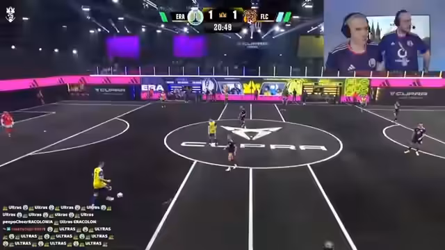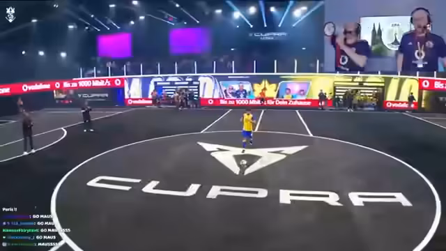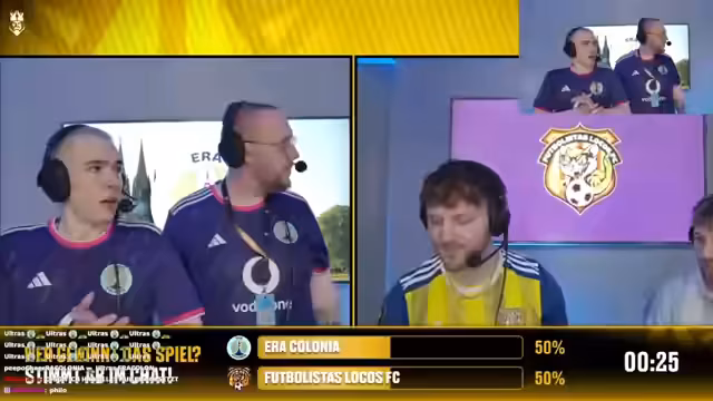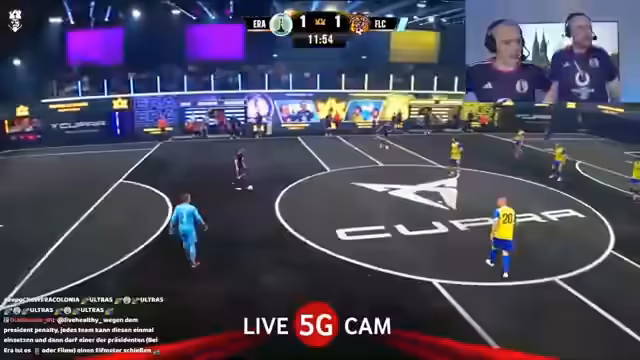 02:10:40Der Stream beginnt mit enthusiastischen Fanrufen und dem Start eines Fußballspiels in der Cupra Arena. Es gibt erste taktische Absprachen und die erste Halbzeit verläuft defensiv, mit wenigen Torchancen. Der Kommentator äußert sich sehr zufrieden mit der Leistung der Spieler. Nach einer Verletzungspause wird das Spiel fortgesetzt und ERA Colonia geht in Führung. Die Footballistas Locus antworten direkt mit einem Ausgleich und es steht 1-1.
