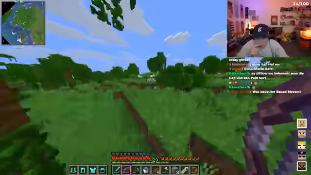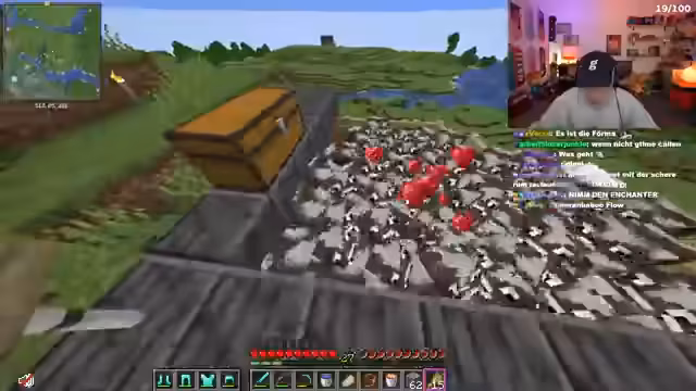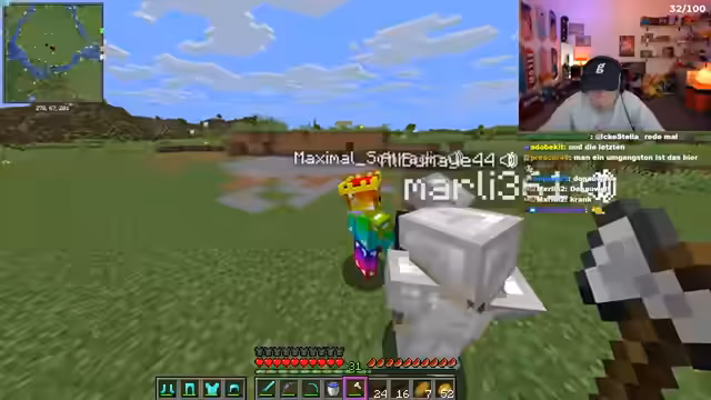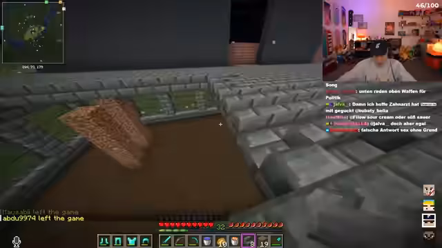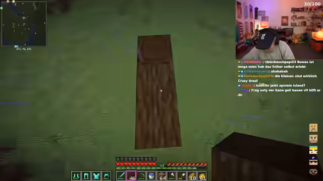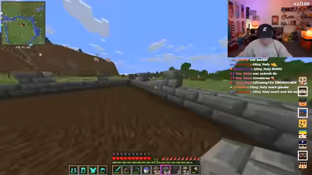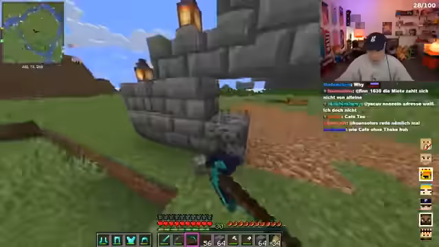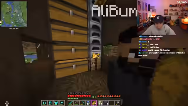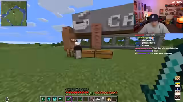 02:38:20Die Gruppe arbeitet gemeinsam am Café-Bau, mit klaren Aufgabenverteilungen: Philo übernimmt Anleitungen, Mali und G-Time beschaffen Materialien wie Kohle, Wolle und Farbstoffe. Es kommt zu einer Handelsanfrage von Mert, der nach Lapis Lazuli (blauer Farbstoff) fragt und im Gegenzug Wolle anbietet. Diskussionen über die Café-Eröffnung und die Einbindung weiterer Spieler laufen, während praktische Bauprobleme gelöst werden, etwa die Gestaltung des Bodens mit Dark-Oak-Holz und die Beschaffung von Tinte für schwarze Farbstoffe.