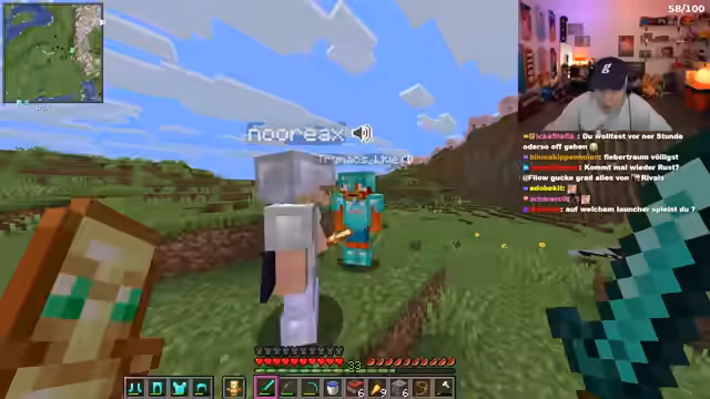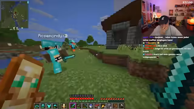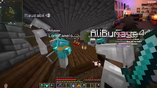 01:50:19Während des Café-Baus am Spawn (mit Dark-Oak-Boden und Deepslate-Elementen) konfrontiert der Streamer G-Time mit Gerüchten über dessen mutmaßliche Zerstörung eines Villager-Dorfs. G-Time bestreitet dies und verweist auf sein Alibi am Eisberg. Parallele Konflikte um ein angeblich geplundertes Dorf ('Gamers Time'-Schild) und freigelassene Schweine eskalieren. Trotzdem wird der Bau fortgesetzt, wobei Designkompromisse (z. B. Baklava statt Kuchen) diskutiert werden.