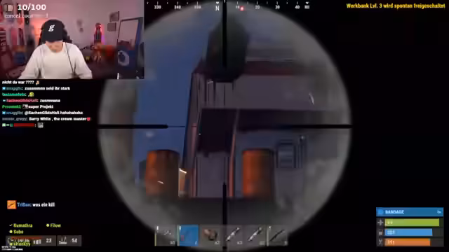 05:27:20Die Gruppe diskutiert über ihre Vorgehensweise in Bezug auf Sprengstoff und ob die Gegner Geschütztürme haben. Sie werden von links beschossen. Ein Spieler rennt in Richtung 300 weg, während Sebo versucht, ihn zu verfolgen. Die Gruppe roofcampt und überlegt, wie sie gegen die Gegner vorgehen soll. Ein Spieler namens Sebo befindet sich in der Nähe und die Gruppe plant, die Gegner zu zergen. Es wird die Frage aufgeworfen, ob ein Spieler cheatet. Die Gruppe sichtet einen Spieler bei 160 und versucht, ihn zu treffen. Der Spieler versteckt sich hinter einem Baum und läuft Zickzack. Ein Spieler namens Strobel taucht auf und wird als nervig empfunden. Die Gruppe wird von Bären angegriffen und ein Spieler spawnt falsch. Es wird diskutiert, wie viel Schaden die SKS verursacht und ob der Gegner Heilgegenstände verwendet.
