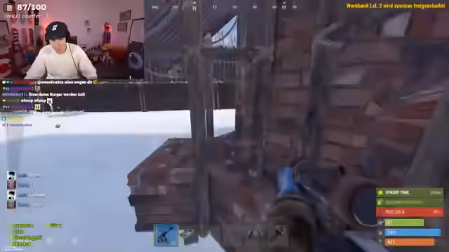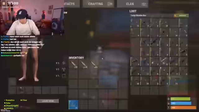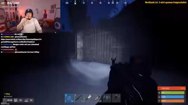 00:22:41Da die Zeit bis zum Wipe nur noch kurz ist, werden Pläne für die letzten Stunden auf dem Server geschmiedet. Man einigt sich darauf, die Kisten zu leeren und keine neuen zu bauen. Der Streamer beschließt, alle Spieler zu erschießen, auf die er trifft, um sich beliebt zu machen und Rache zu nehmen. Man beschließt, das Rust-Projekt vorübergehend zu beenden, um eine Solo-Rig auf einem offiziellen Server zu jagen, scheitert aber am Server-Population.