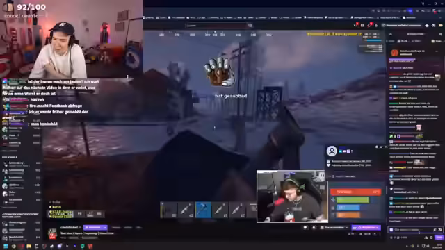 09:21:07Nach einigen erfolgreichen Runden, bei denen der Streamer und seine Mitspieler mehrere Gegner eliminieren, steigt die emotionale Spannung. Der Streamer kritisiert einen Mitspieler namens Heros, der offenbar nicht auf die Kommunikation reagiert und Musik hört, was die Taktik behindert. Es kommt zu verbalen Auseinandersetzungen, wobei der Streamer herabsetzende Bemerkungen macht und den Mitspieler als 'benebelt' und 'dummes Stück' bezeichnet, was zu einer angespannten Atmosphäre im Team führt.