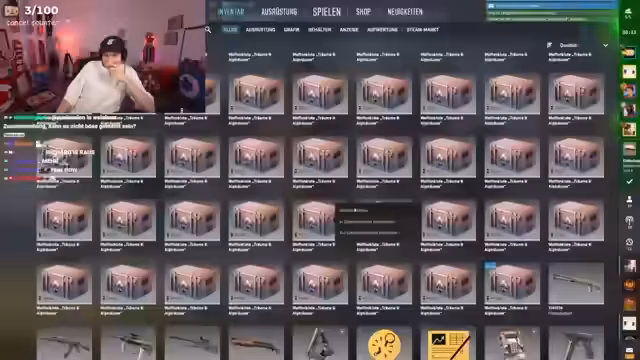 09:43:40Nach einem turbulenten Spielende, bei dem ein Mitspieler den Account verloren hat und das Team somit unvollständig ist, kehrt der Streamer zu seinem Hauptgeschehen zurück, dem Öffnen von Kisten. Er erwähnt die bisherigen Einnahmen von über 100.000 Euro und startet ein neues Kisten-Opening. Um das Engagement zu steigern, sucht er aktiv nach einem Investor für einen Case-Race gegen einen Mitspieler, bei dem der Gewinner alle Kisten erhält. Damit wird die Spannung und der Wettbewerb im Chat erhöht.