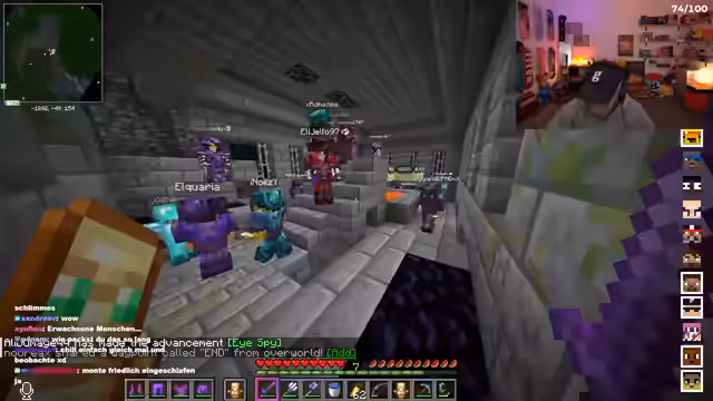 03:03:06Die Gruppe diskutiert die Reise ins End und die Notwendigkeit, Nether-Portale für schnellere Wege zu nutzen. Spieler wie Fabo und Schradin planen, Portale zu bauen, um nachzukommen, wenn andere bereits im End sind. Es gibt Verwirrung über fehlende Items wie Schaufeln und Pfeile, während gleichzeitig versucht wird, durch Schlafen die Zeit zu überbrücken. Die Kommunikation wird chaotischer, als Spieler absterben und um Hilfe bitten, während sie versuchen, sich am Spawn zu sammeln.
