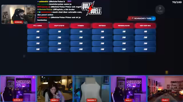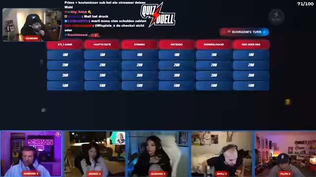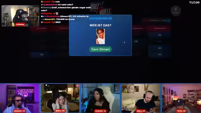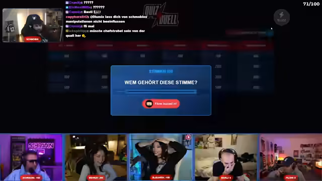 01:10:34Der Livestream beginnt mit einem Quiz-Format, in dem die Teilnehmer Fragen aus verschiedenen Kategorien beantworten. Zu Beginn geht es um Anime-Wissen, wo nach dem Charakter 'Vegeta' gefragt wird. Die Regeln werden erklärt: Bei falschem Buzzern gibt es Minuspunkte (Hälfte der möglichen Punkte). Es folgen Fragen zu Hauptstädten wie Litauen (Hauptstadt Vilnius), die Korrektur von Punkteständen und Diskussionen über unbekannte Stimmen oder Sounds. Die Teilnehmer interagieren über Discord, um Audio-Probleme zu lösen, und diskutieren über die Identität von Stimmen, die Basti GHG ähneln könnten.