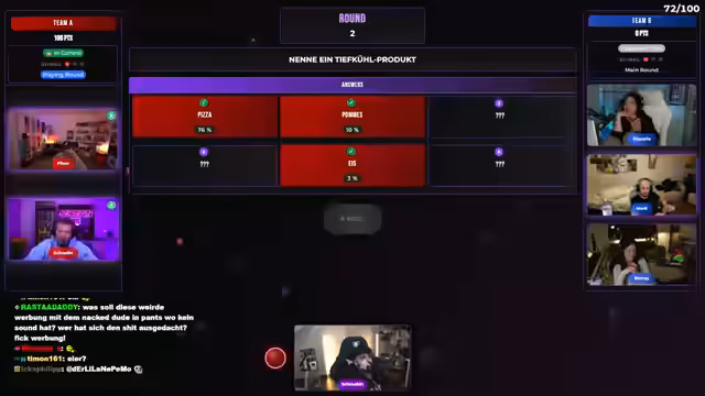 01:54:41Der Übergang zum FITNA-Craft END Event erfolgt mit einem neuen Format, bei dem Teams (Team Rot mit Philo/Sam, Team Blau mit Schradin/Mali) Zuschauerantworten aus Umfragen erraten müssen. Nach Anmeldung über Twitch wird die erste Frage gestellt: 'Wer stiftet am meisten in FitnaCraft?'. Mit 30% nennt Trimax die häufigste Antwort. Es folgen Fragen zu Tiefkühlprodukten, wobei Pizza (76%) dominiert. Diskussionen über Gemüse (Brokkoli, Spinat) und strategische Calls bestimmen den Wettbewerb, bei dem Teams durch richtige Antworten Punkte sammeln können.