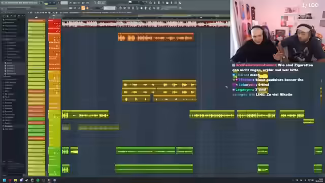 01:34:31Nach einer Unterbrechung wird die Songproduktion mit Philo fortgesetzt. Es geht um einen Banger, der vorgestern entstanden ist. Der Streamer stellt sein FL Studio Streaming Setup vor, das eine farblich sortierte und gechannelte Vocal Chain enthält. Es werden technische Aspekte wie die Vermeidung von Latenz durch bestimmte Plugins und die Aufnahme von Adlib-Spuren erläutert. Man arbeitet intensiv an Text und Melodie.
