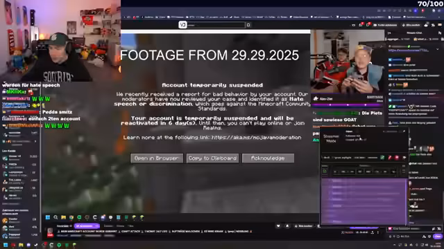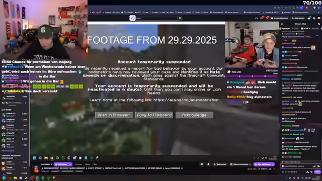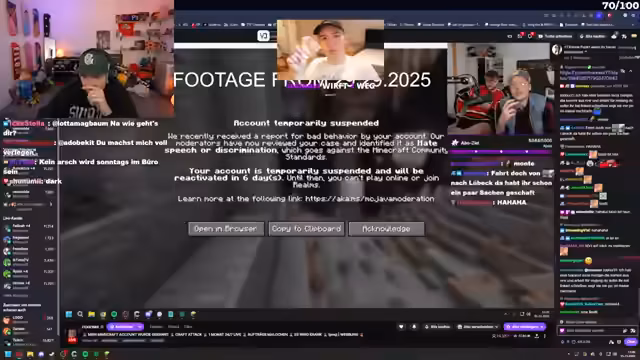 02:12:09Felix wird um 16 Uhr an einem Charity Royal Minecraft Event teilnehmen, um Geld zu sammeln. Der Streamer prüft parallel ein Charity-Ding, das ihm Veni geschickt hat, und vermutet, dass es sich um ein anderes Event handelt als das, bei dem Kevin und Noreax mitmachen. Es wird über die Beschaffung von Terrakotta gesprochen, wobei der Streamer drei Doppelkisten benötigt und Dima viel davon besitzt. Der Streamer ist nicht bei der Party gestern gewesen, aber sein Bruder war dort und wurde manchmal mit ihm verwechselt. Es wird ein spontaner Plan geschmiedet, nach Schweden zu fahren, um gegen einen Minecraft-Bann zu protestieren. Der Streamer ist von Minecraft online spielen gesperrt und kann keinen Multiplayer mehr nutzen. Es wird diskutiert, ob eine Bannumgehung vor tausenden Zuschauern zu einem permanenten Account-Bann führen könnte, was das Ende seiner Minecraft-Content-Produktion bedeuten würde. Die Planung der Reise und des Protests wird live im Stream besprochen, inklusive der Organisation von Equipment und einem Kameramann.